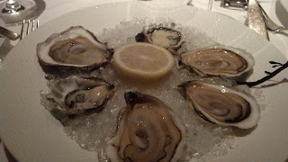 The pasta with shrimp was done in a spicy marinara sauce over fresh spaghetti. The duck was presented two ways - roasted breast and confit leg with wild rice and au jus. The sirloin with steam vegetables had a blackened crust and cooked to a perfect medium rare. And finally the chicken over polenta done with...cranberries or maybe cherries? I don't quite recall. The pasta was so flavorful and fresh it seemed weightless; the duck was awesome - when done right, there's no better expression of fowl than leg of confit duck. The sirloin had a nice flavor and a good balance between tender and yet hearty and finally the chicken was super moist and avoided any pitfalls of being too "ordinary". I personally think the duck took top honors but all four dishes were very good.